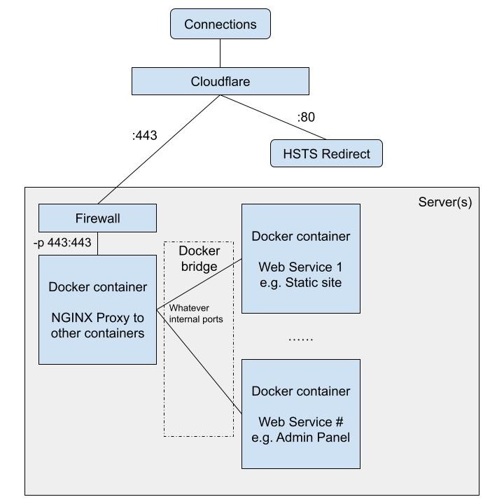 HTTP connections going to Toyshost Servers are proxied through Cloudflare. The redirection of insecure connections to TLS-encrypted connections are done and enforced on the Cloudflare side. Then the encrypted connections are routed to the server, and eventually arrive the main NGINX Docker container by -p 443:443 port forwarding rule.